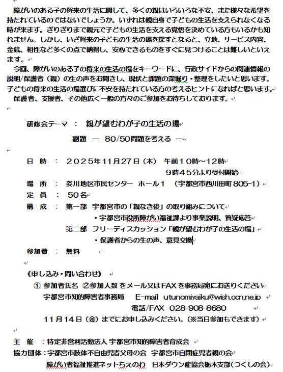 第二回 研修会開催のお知らせ(11/27)「親が望むわが子の生活の場」 2025年10月30日 最終更新日時 : 2025年10月30日 utunomiyaiku ■「親が望むわが子の生活の場」と題し、令和7年度 第二回研修会を11/27(木)、姿川地区市民センターにて開催します。詳細は下記案内をご参照ください。 今回は行政の取り組みと保護者の声を聴き広く意見交換を行います。多くの方のご参加をお待ちしております。 \ 最新情報をチェック /